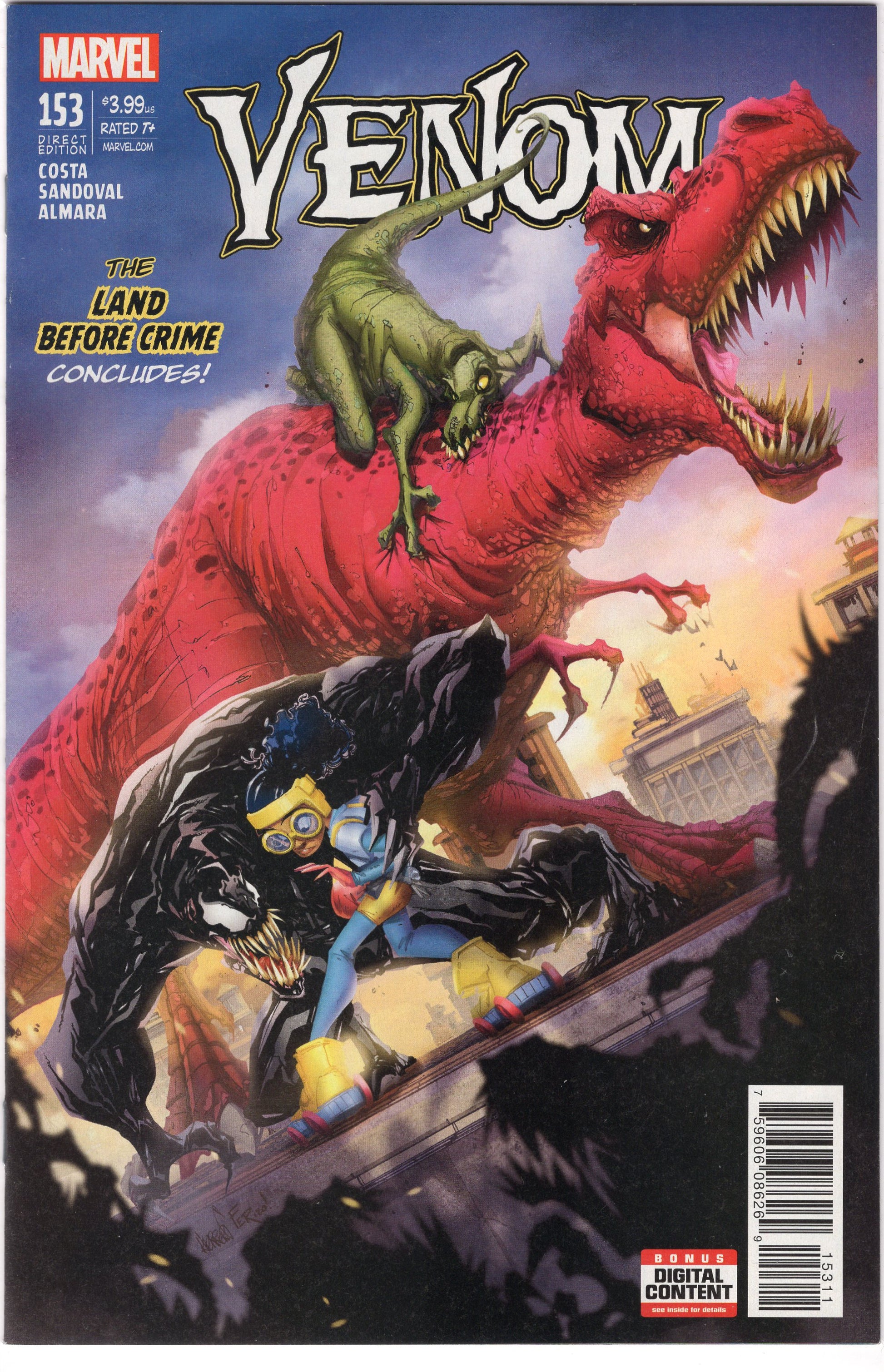 "THE LAND BEFORE CRIME" CONCLUDES! • Eddie Brock and the Venom symbiote are having a tough time sticking together, biologically speaking. Fortunately, the fine folks at ALCHEMAX are working on a cure! • Eddie just has to find and stop Stegron the Dinosaur Man from turning New York into a raging army of dinosaurs for them! • Luckily, MOON GIRL AND DEVIL DINOSAUR are around to help! I wonder if they realize Stegron can control dinosaurs in addition to turning people into them. Rated T+